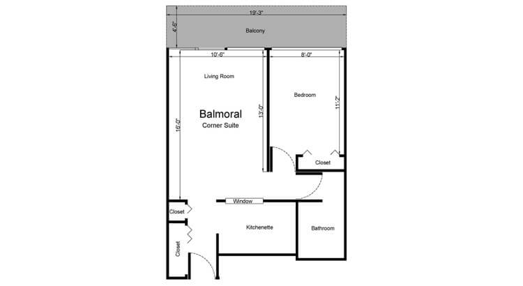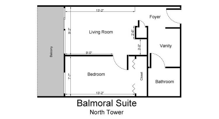 The Balmoral Suite is for one or two people and provides a comfortable bedroom, a living room, a balcony and closet space.